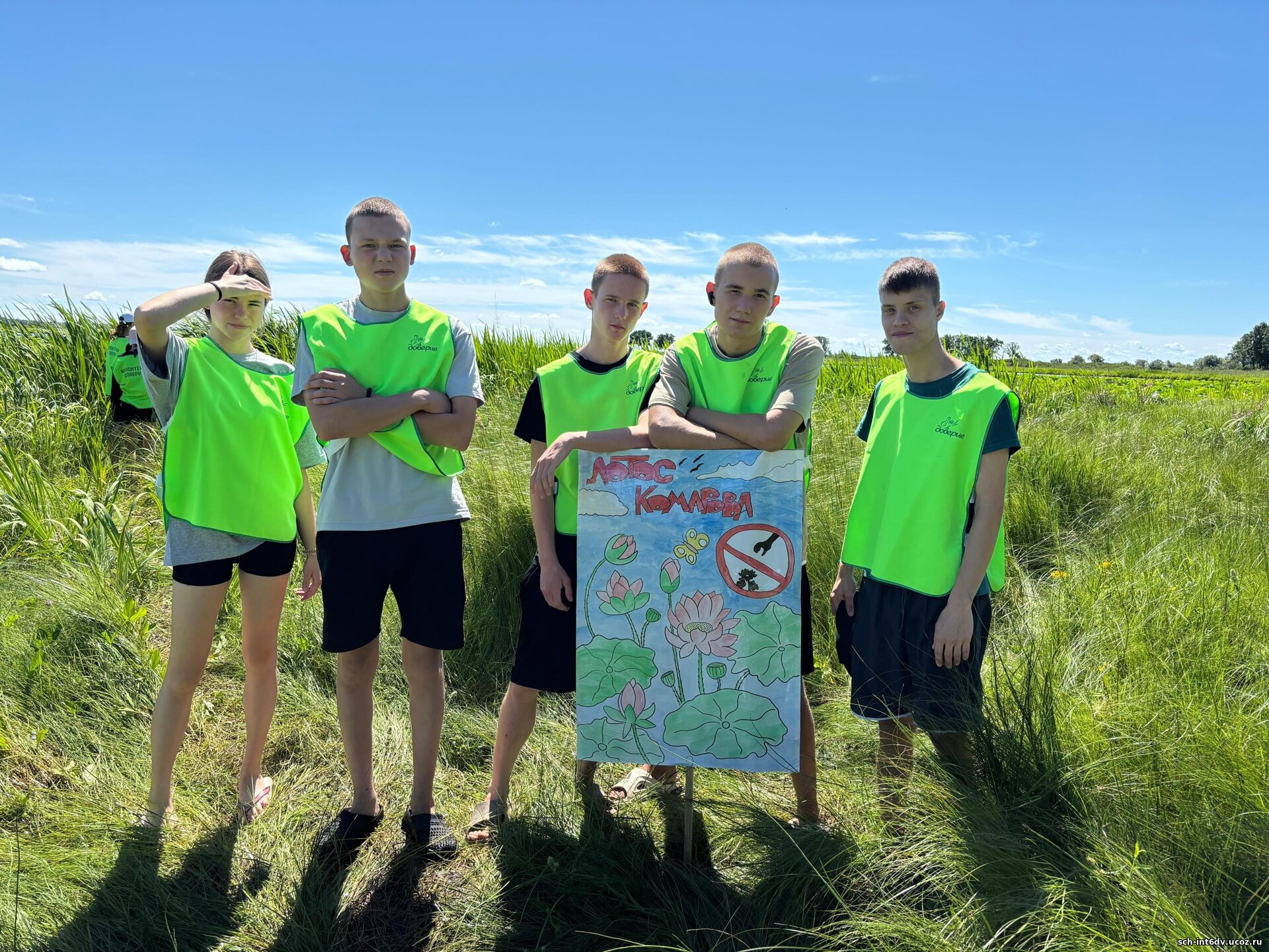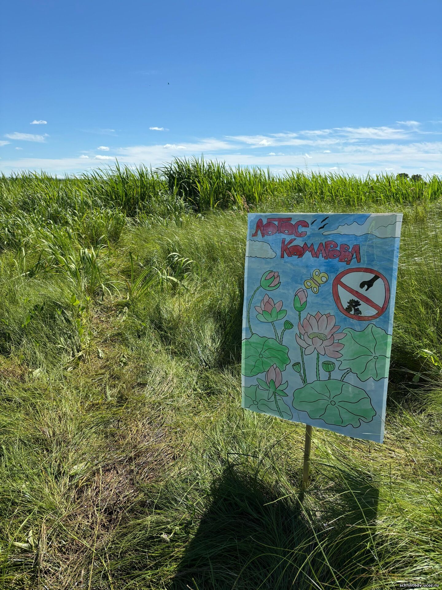 Ребята обратили внимание, что поверхность листа лотоса отталкивает воду, и она шариками скатывается с поверхности. Подростки бережно исследовали местных представителей флоры и фауны. Поставили табличку на берегу, напоминающую о бережном отношении к природе .